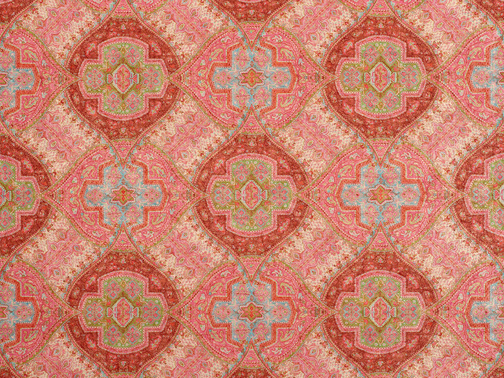 Узор на ткани, воспроизводящий рисунок гуашью 19 века для проекта ковра, сохранившийся в архивах Дома Пьера Фрея. Он обработан зеркально и напечатан на мерцающем металлическом основании, что придает ему красивый переливающийся вид