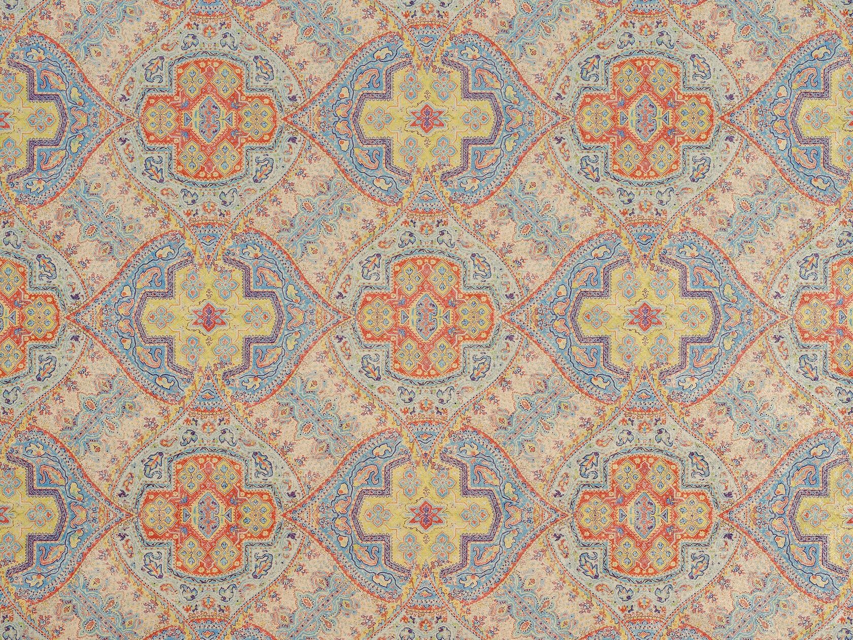 Узор на ткани, воспроизводящий рисунок гуашью 19 века для проекта ковра, сохранившийся в архивах Дома Пьера Фрея. Он обработан зеркально и напечатан на мерцающем металлическом основании, что придает ему красивый переливающийся вид