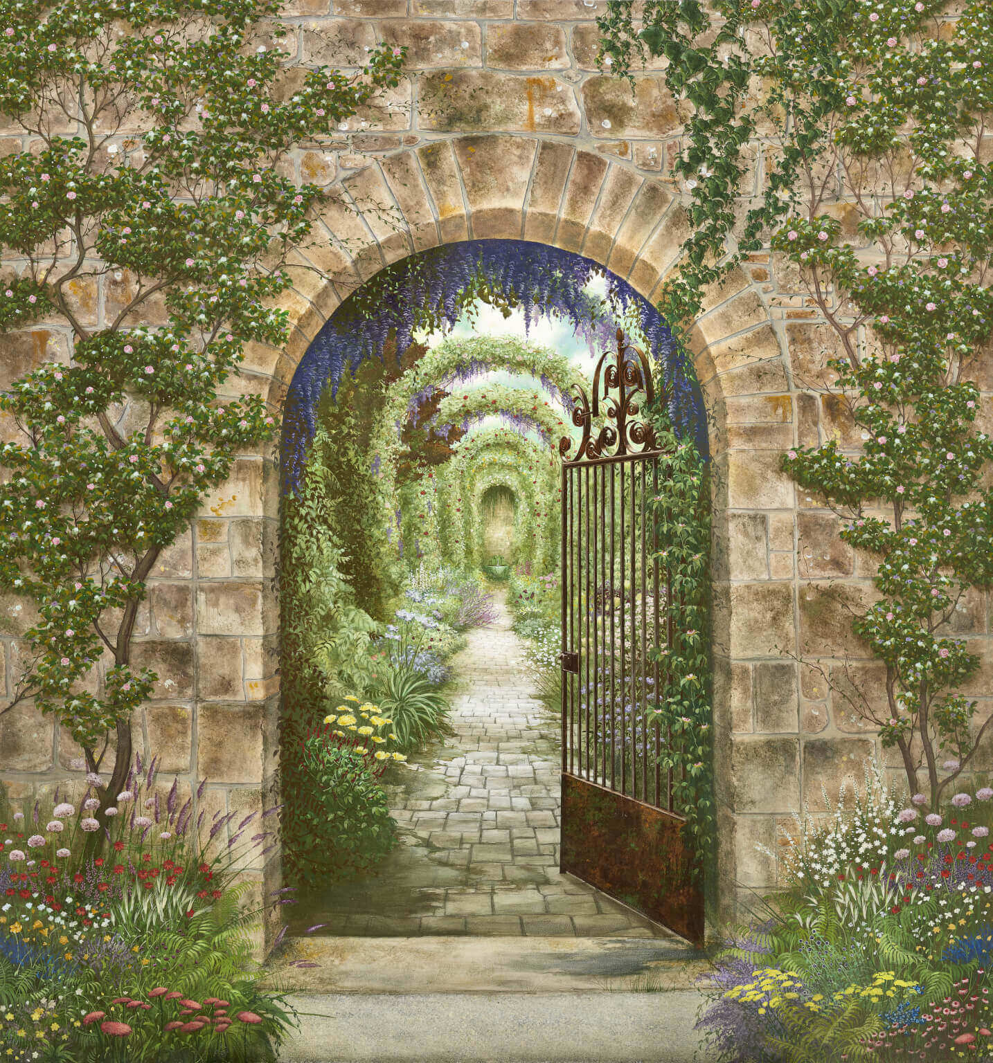 Прогуливаясь по саду, поэтическая арка приглашает нас пройти по тропинке красочного цветущего сада. Таинственная прогулка, нарисованная Седриком Пельтье с удивительной реалистичностью. Эта панорама напечатана на матовой флизелиновой основе