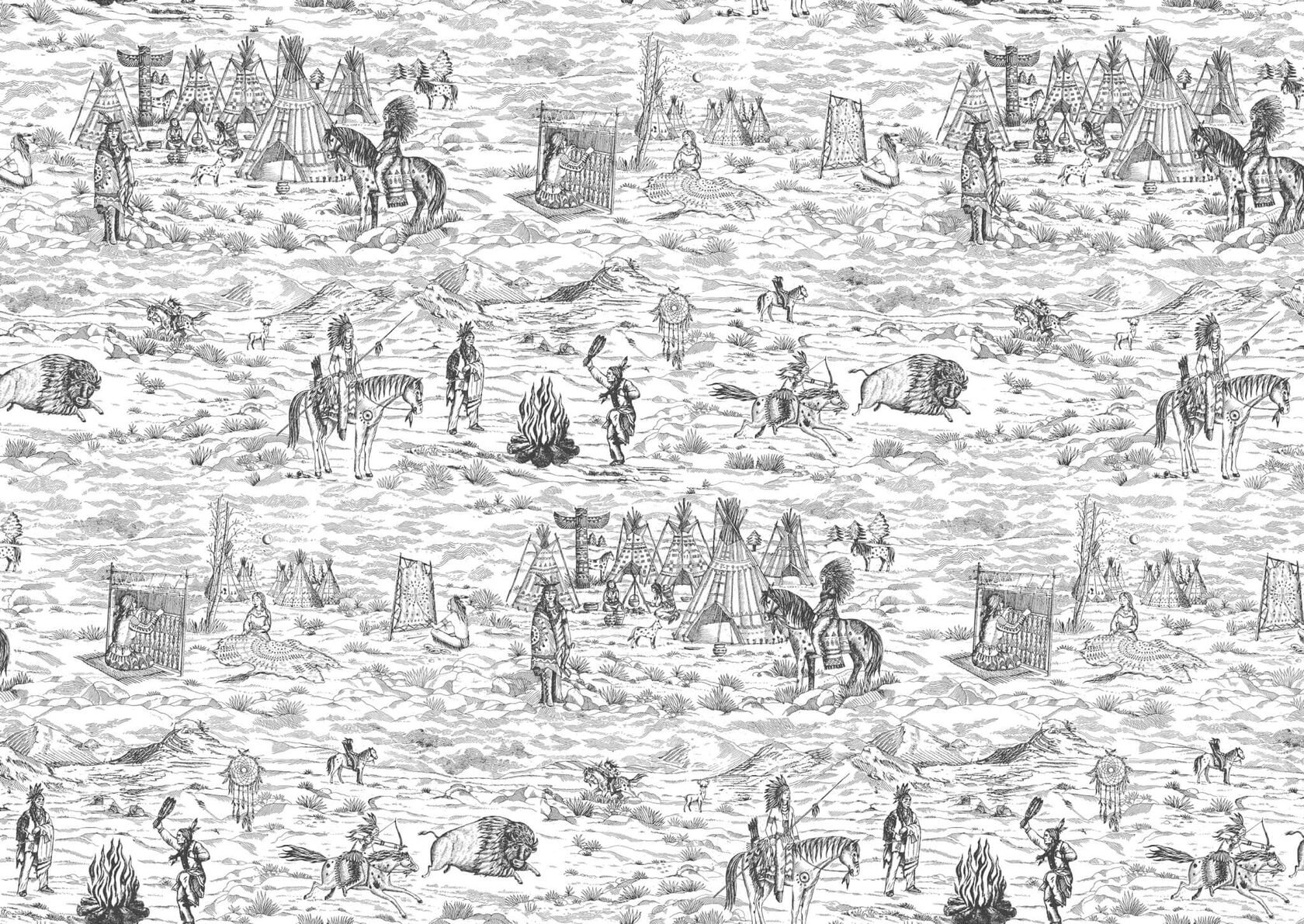 Вначале "лакота" означало "дружба". Эта нарисованная вручную иллюстрация повседневной жизни и традиций коренных американских племен отдает дань уважения народам, которые были близки к природе и чувствительны к различным элементам. Монохромная расцветка добавляет современности. Напечатано на сверхширокой нетканой бумаге с эффектом промокашки, напоминающим альбом для рисования